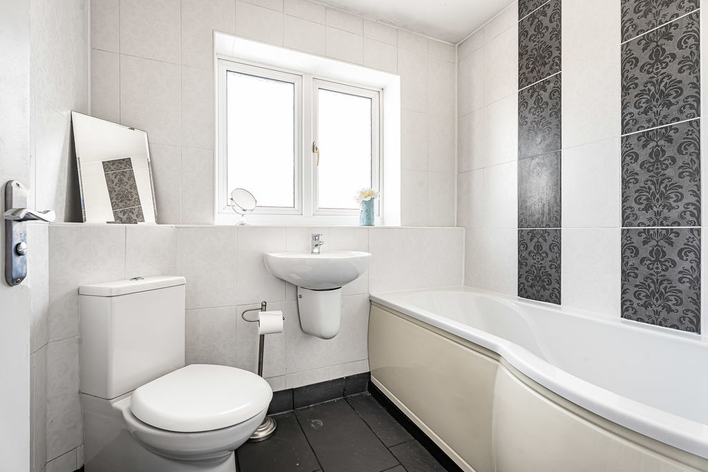Frosted double glazed window to rear aspect. Heated towel rail, low level w.c., wall mounted wash hand basin, tiled walls, extractor fan.