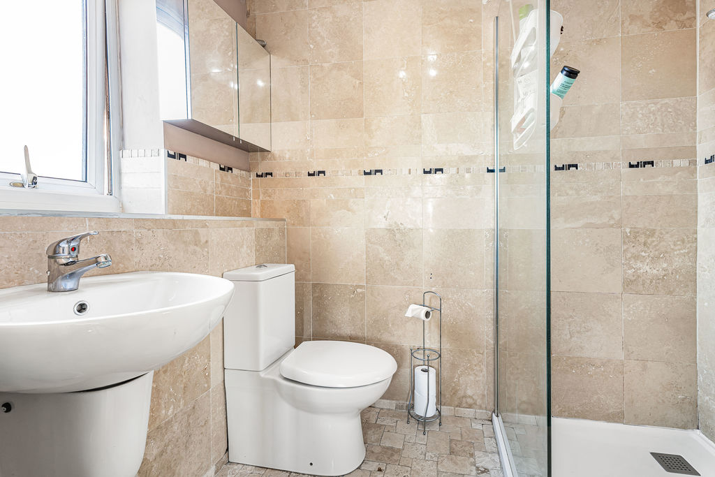 Frosted double glazed window to side aspect. Shower unit, low level w.c., tiled walls, wall mounted wash hand basin, extractor fan.