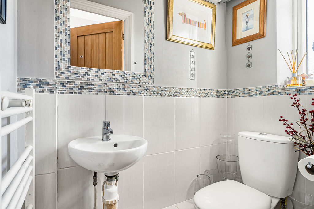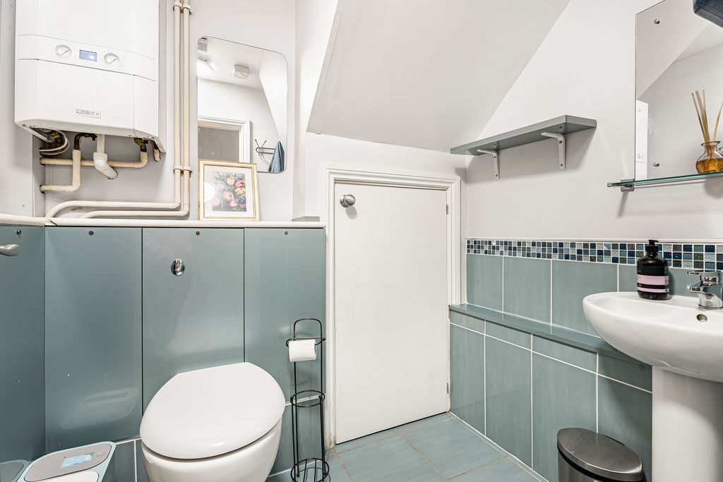 Frosted double glazed window to front aspect. Low level w.c., wall mounted wash hand basin, heated towel rail.
