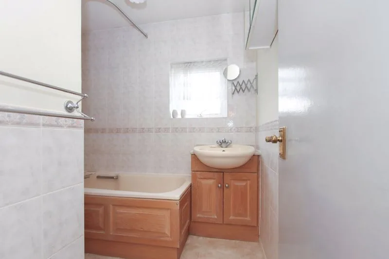 Frosted double glazed window to rear aspect. Panelled bath with shower over, vanity wash hand basin with storage cupboard below.