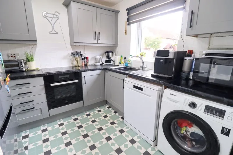 Double glazed window to front aspect. Range of wall mounted and floor standing units with roll edge work surface, stainless steel single drainer sink with mixer tap, integrated electric oven and hob, space for dishwasher, washing machine and fridge/freezer, tiled splash back, radiator.