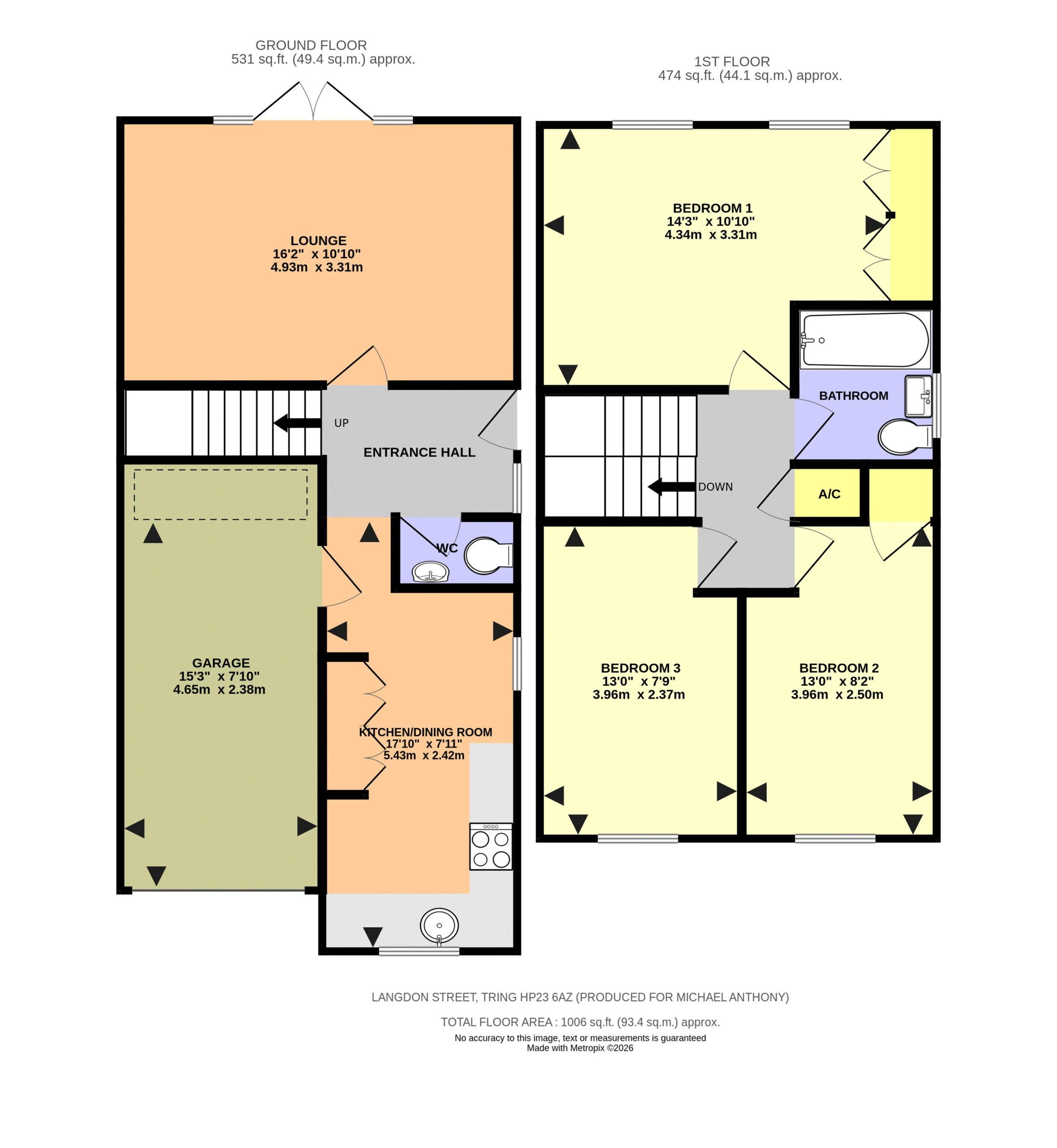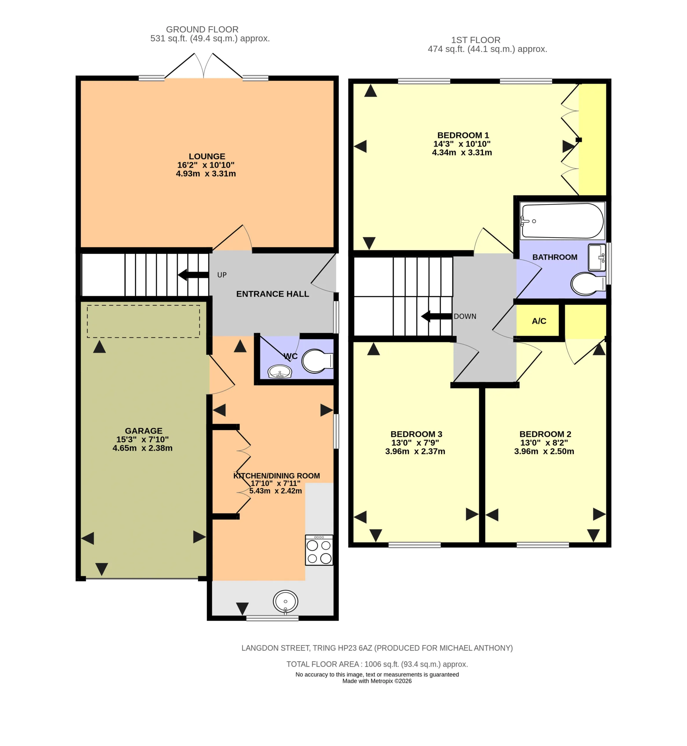 Fitted with a range of both floor and wall-mounted units with wooden work surface over, stainless steel sink unit with mixer tap, built-in oven and hob, plumbing for dishwasher, tiled floor, radiator. Double glazed windows to front and side, personal door to garage.