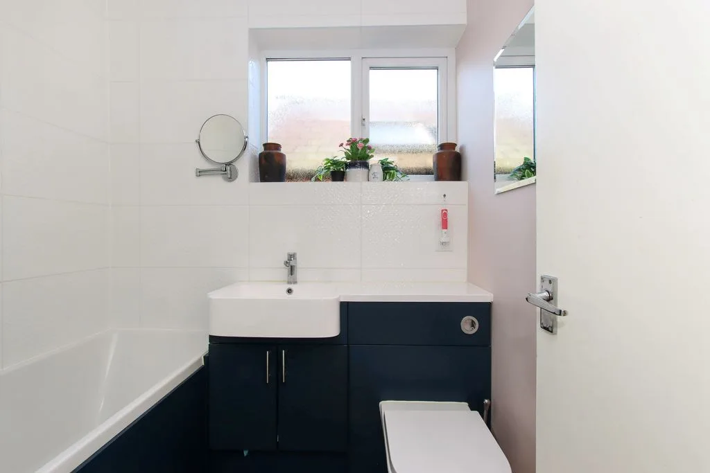 White suite comprising panelled bath with shower unit over, wash hand basin with storage below, low level WC, heated towel rail, part tiled walls, double glazed window to side aspect.