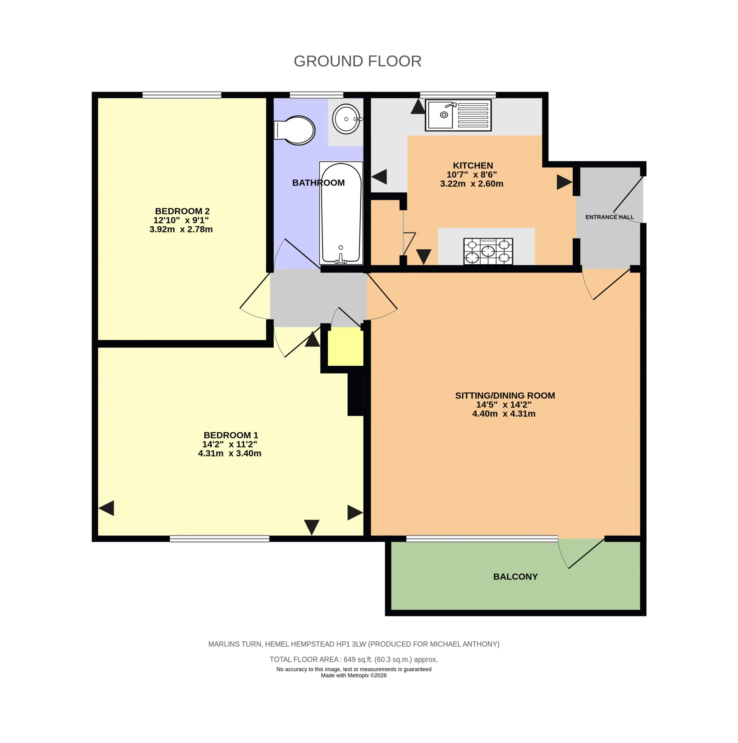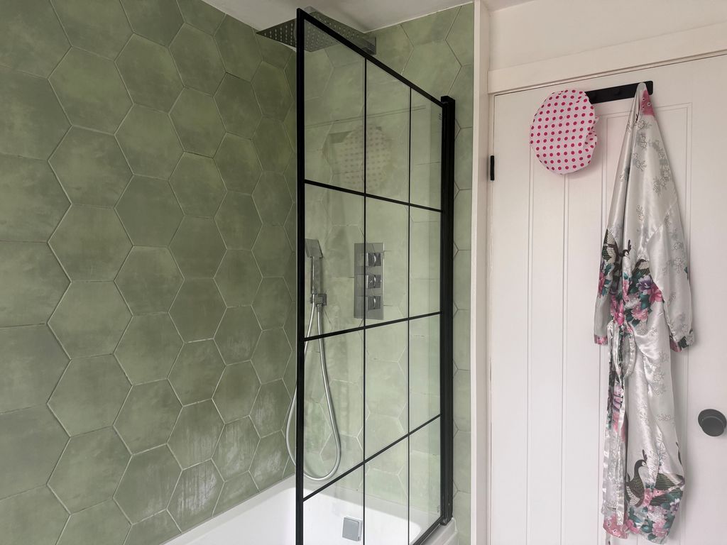 Panel bath with rain shower over, hand wash basin in vanity unit, WC, heated towel rail, extractor fan, frosted double glazed window to side.