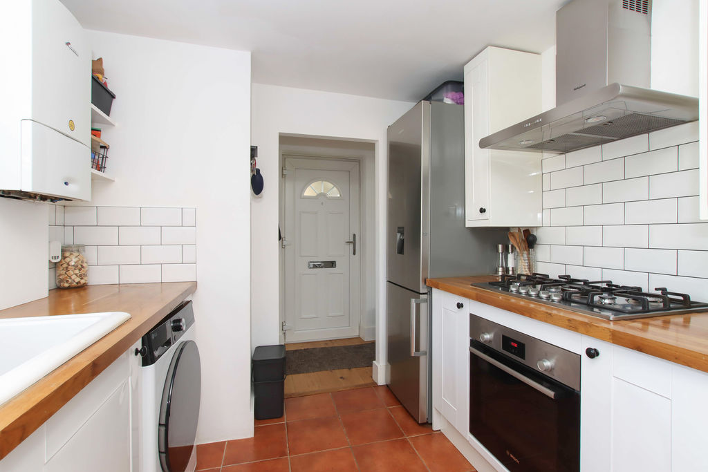 Range of floor and wall mounted units, wall mounted boiler, space for fridge freezer, built in oven, gas hob with extractor fan over, space for washing machine, integrated dishwasher, sink with drainer, storage cupboard, double glazed window to side.