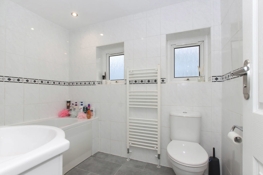 A refitted in white suite comprising `p` shaped bath with mixer tap, power shower attachment and shower screen, pedestal wash hand basin with white high gloss vanity unit with cupboard under and low level WC. Fully tiled surrounds and floor. Heated towel rail. two double glazed windows to the rear.