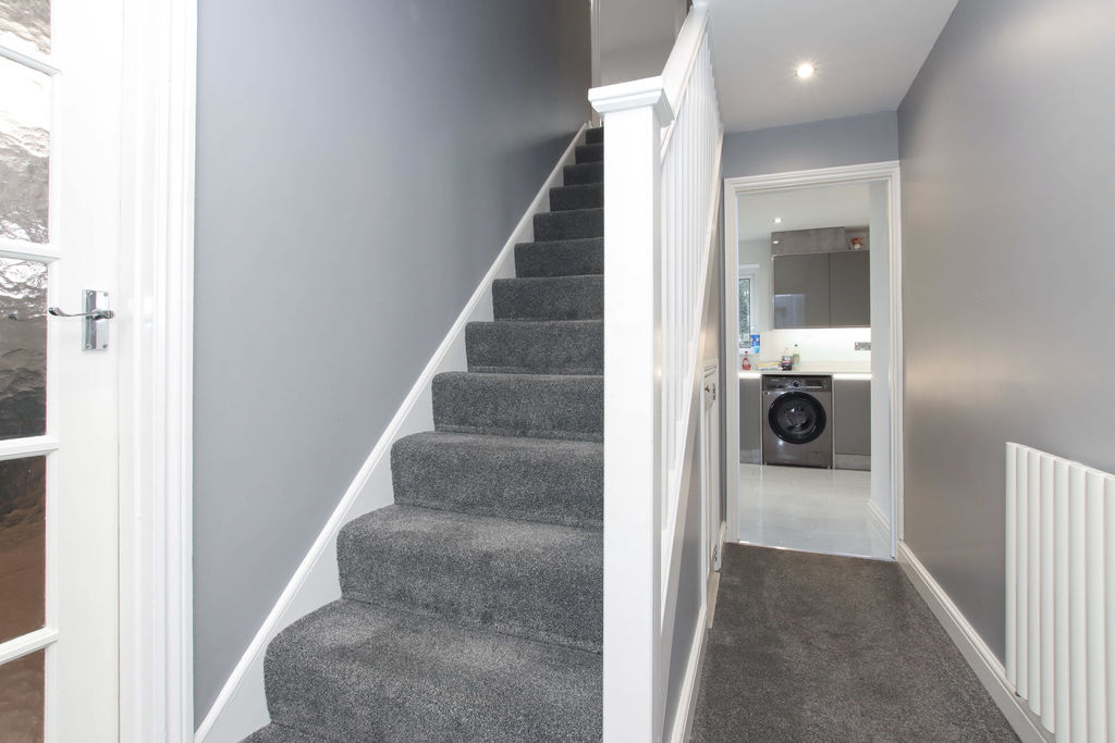 Stairs to the first floor door to airing cupboard. Recessed spot lighting. Access to loft space.