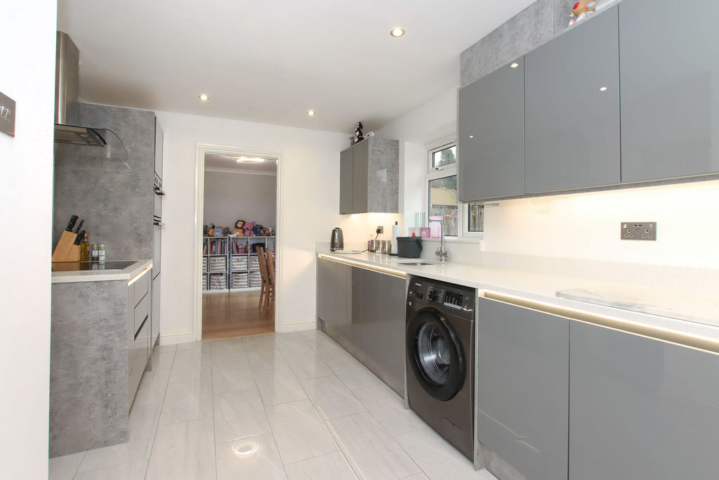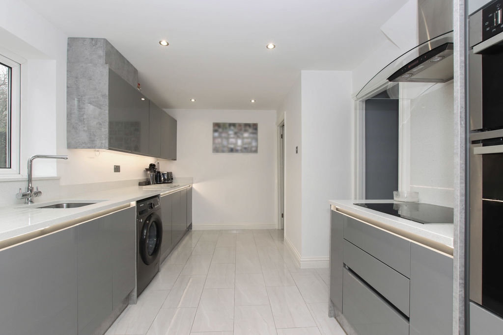 A recently refitted kitchen boasting an extensive range of high gloss base and eye level storage units, ample work surface areas with an inset one and a half bowl sink unit with mixer tap set below double glazed window to the rear, built in electric hob. Wall mounted gas boiler in concealed unit.