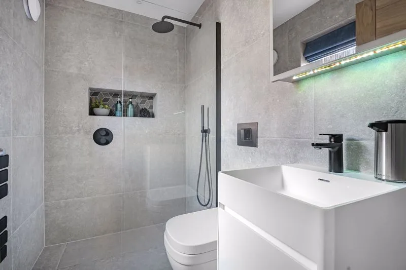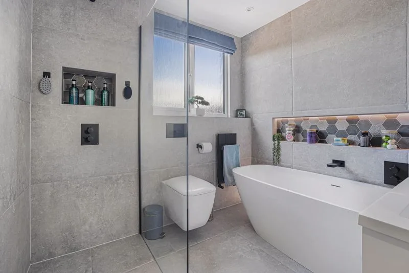Triple glazed window to rear aspect. Wash hand basin in vanity unit with mixer tap, low level WC, freestanding bath with mixer tap, radiator, tiled floor, wet room style shower, tiled walls.