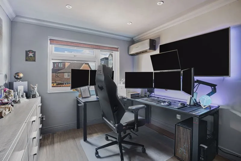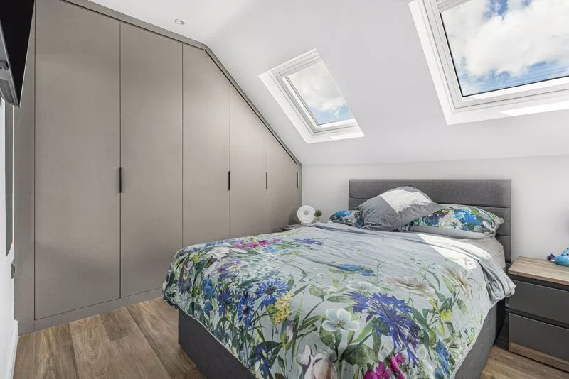 Two triple glazed Velux windows to front aspect. Built-in wardrobe, radiator, air conditioning unit, oak door, eaves storage cupboard housing water tank.