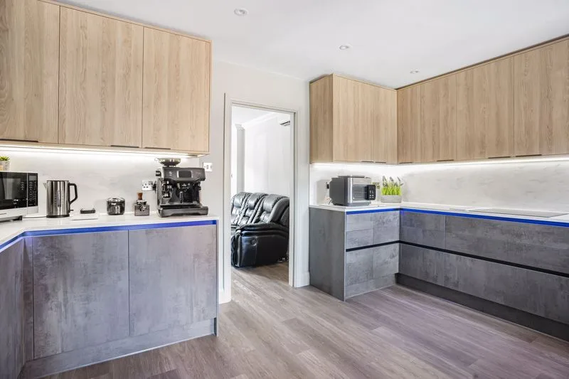 Triple glazed window to rear aspect. Fitted with a range of base and eye level units with Corian work surface and backsplash, two integrated extractor hoods, integrated induction hob and double oven, inset composite sink with mixer tap, space for dishwasher and fridge freezer.