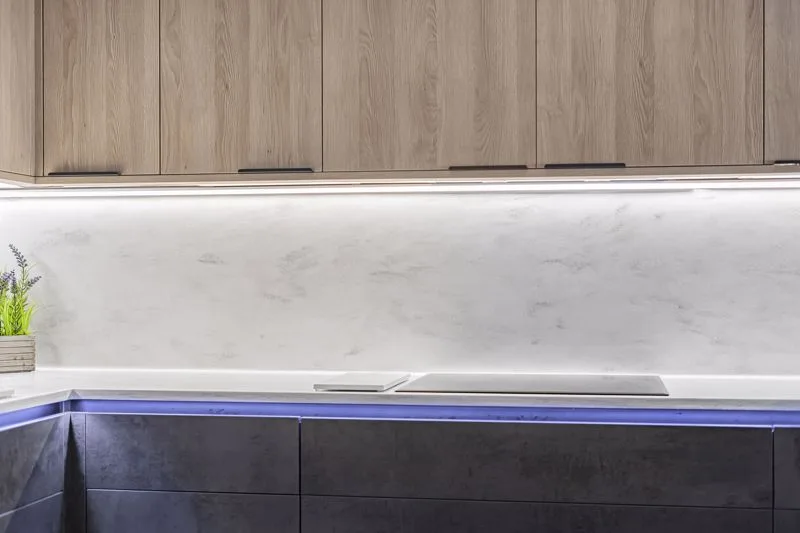 Garage conversion with work surface with space for washing machine and tumble dryer, wall-mounted units, air conditioning unit, radiator, oak door.