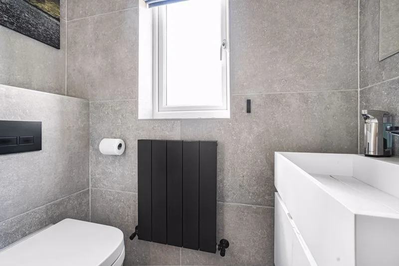 Double glazed frosted window to front aspect. Low level WC, tiled floor, tiled walls, radiator, wash hand basin in vanity unit with mixer tap, oak door.