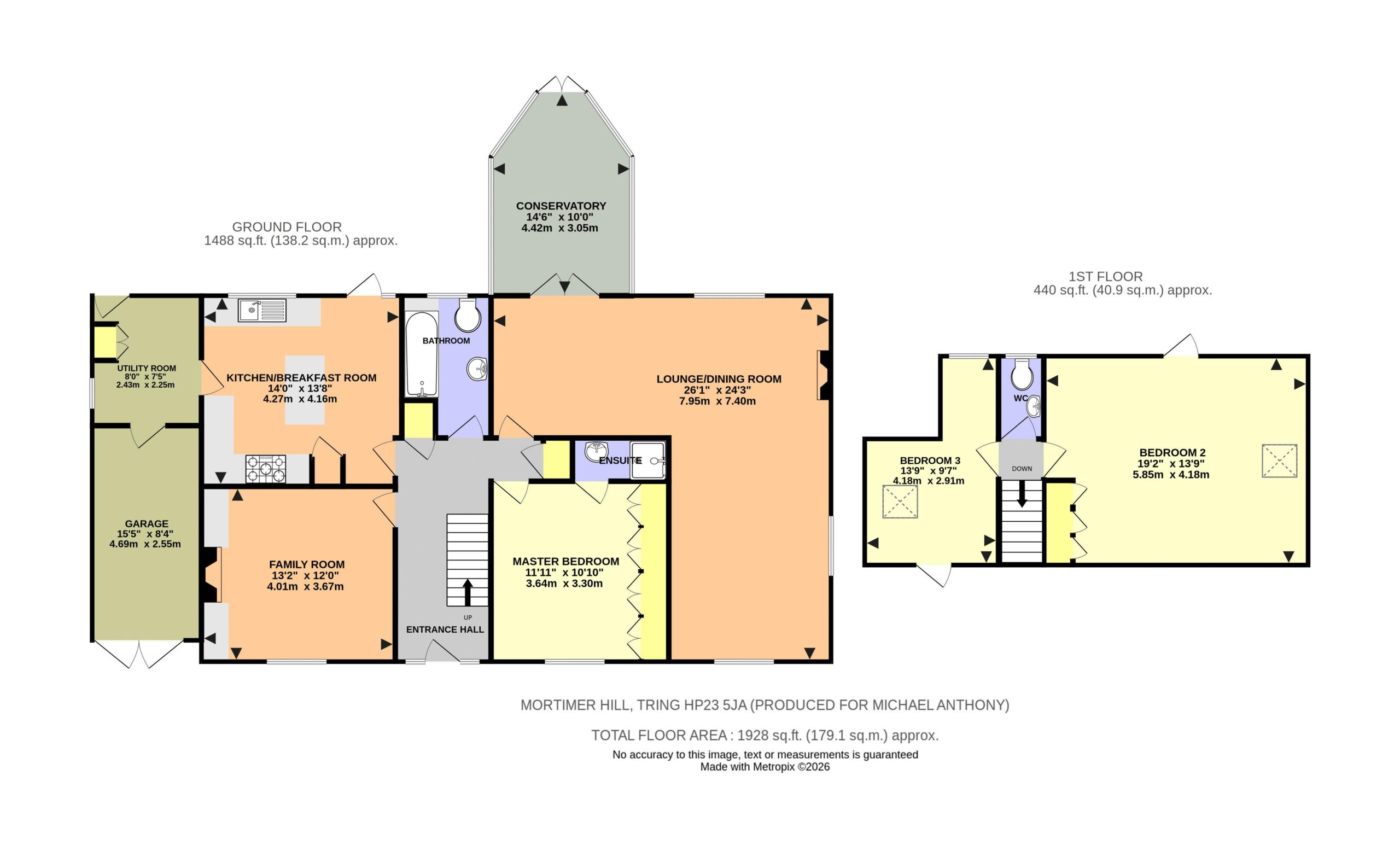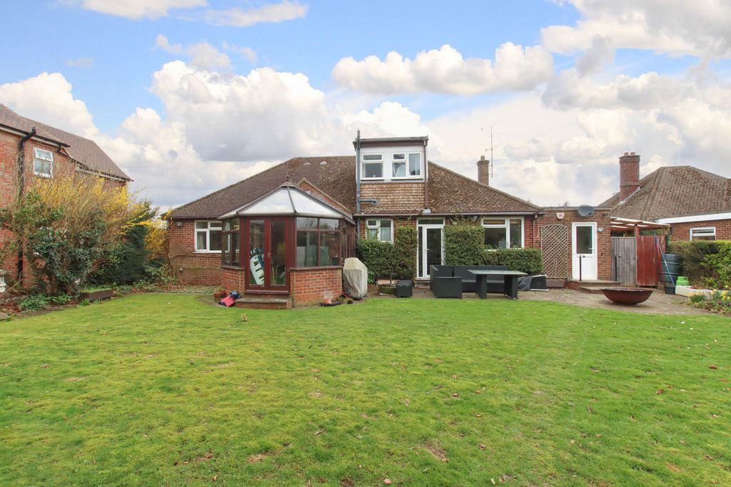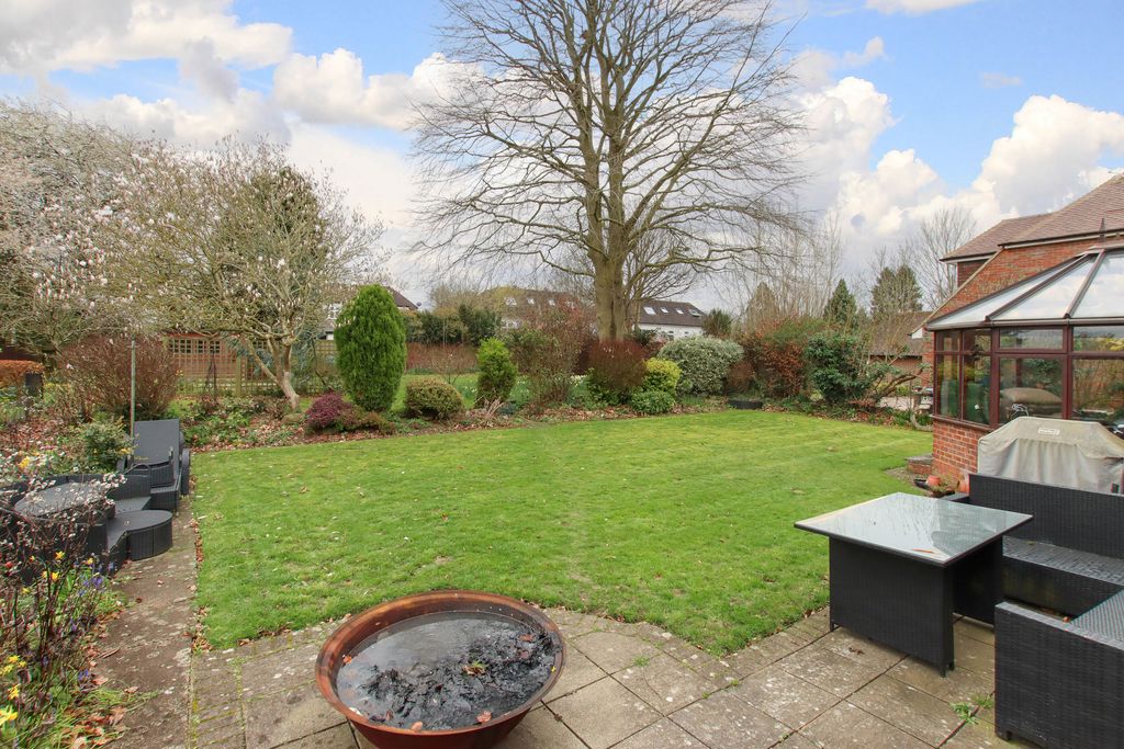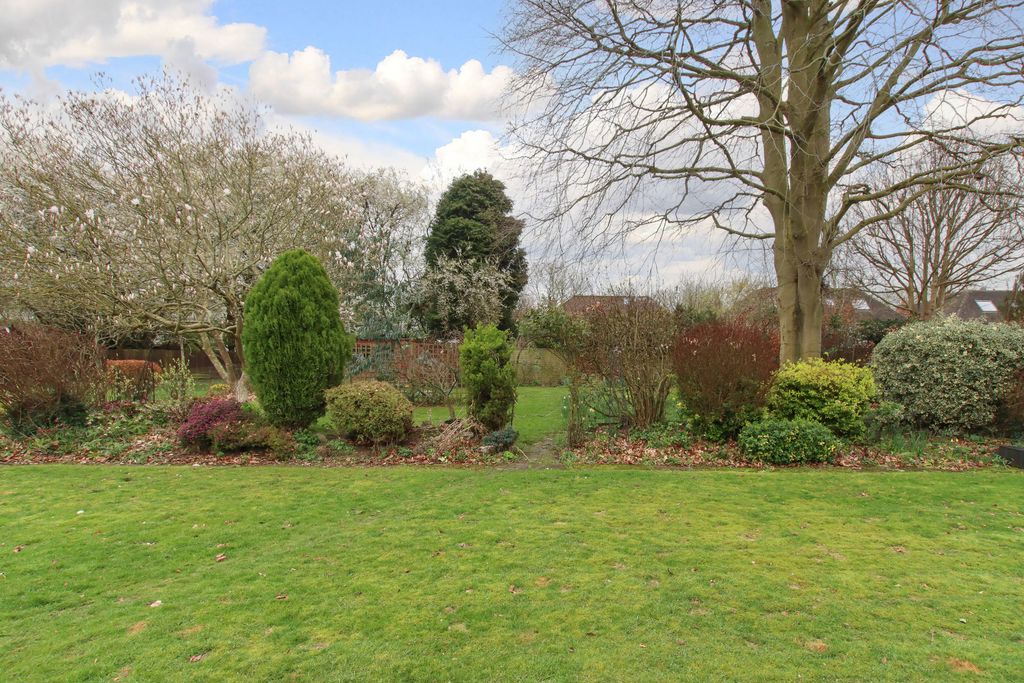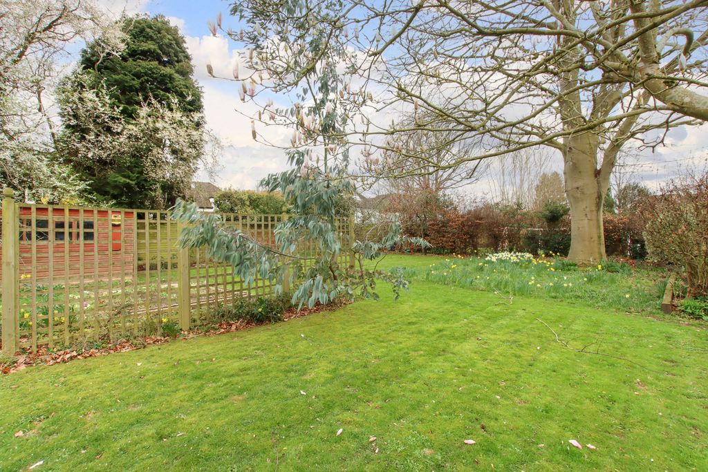 Mainly laid to lawn with flower and shrub beds, patio area, side access, garden shed, outside light and tap.