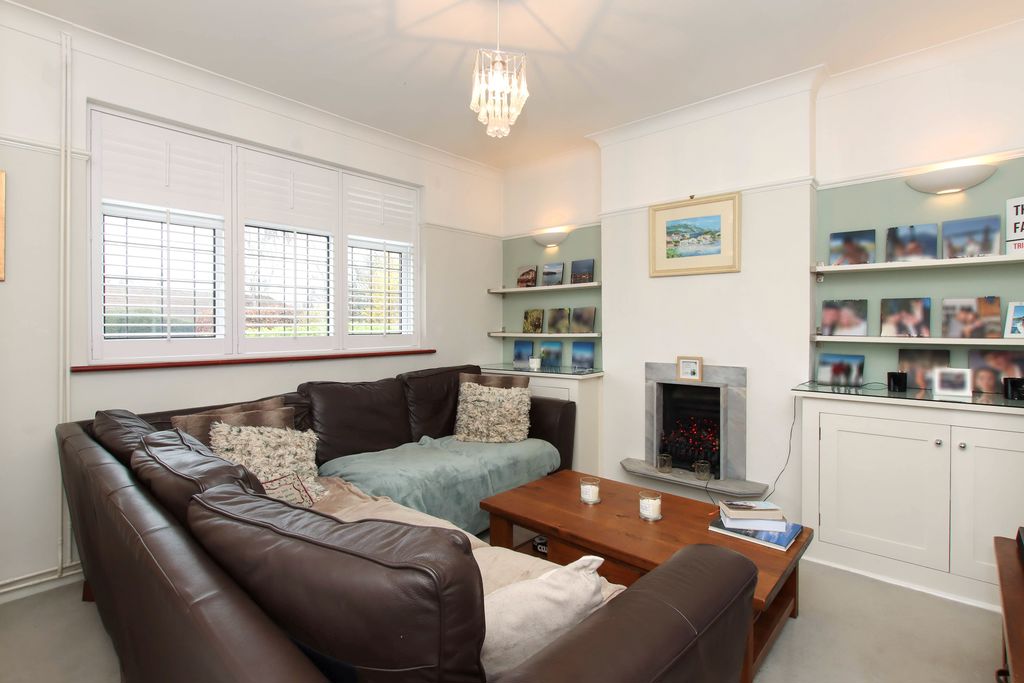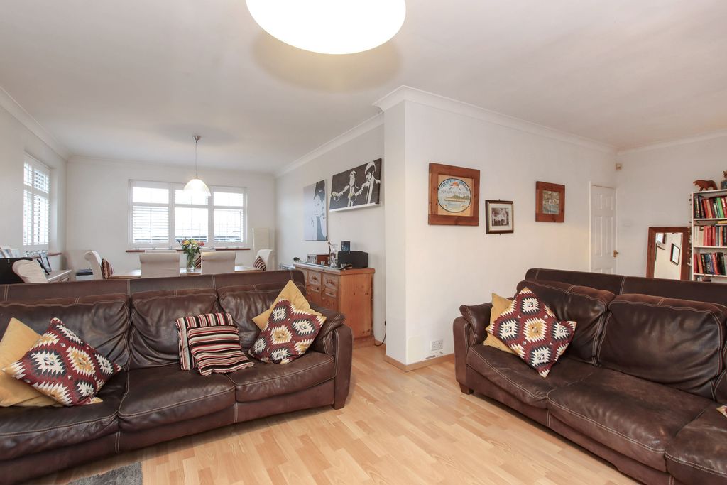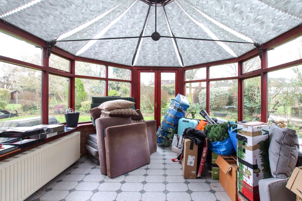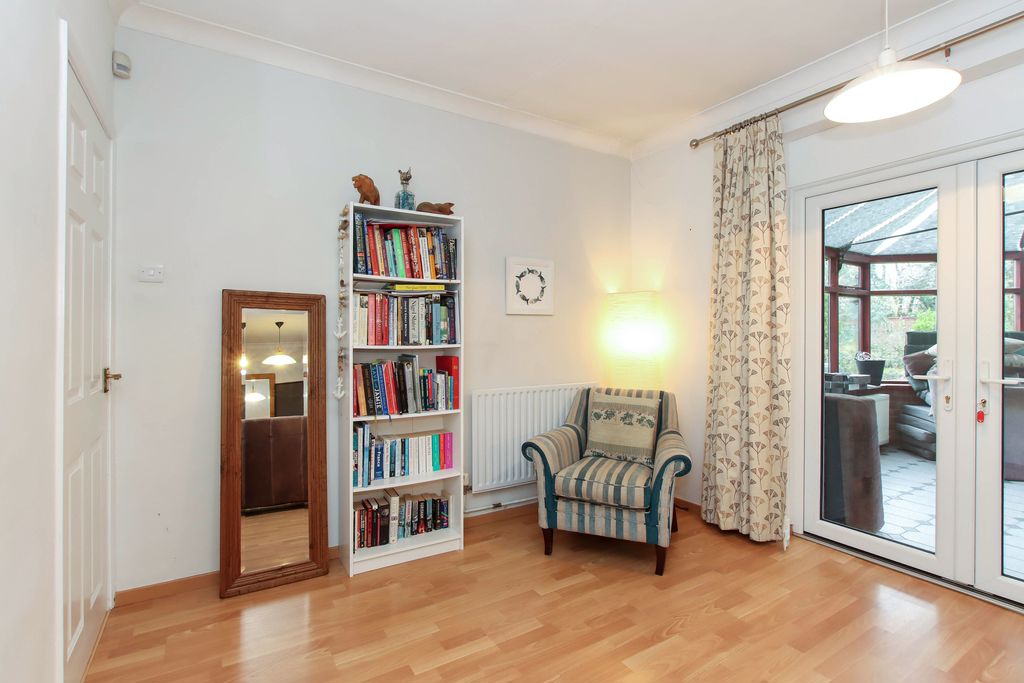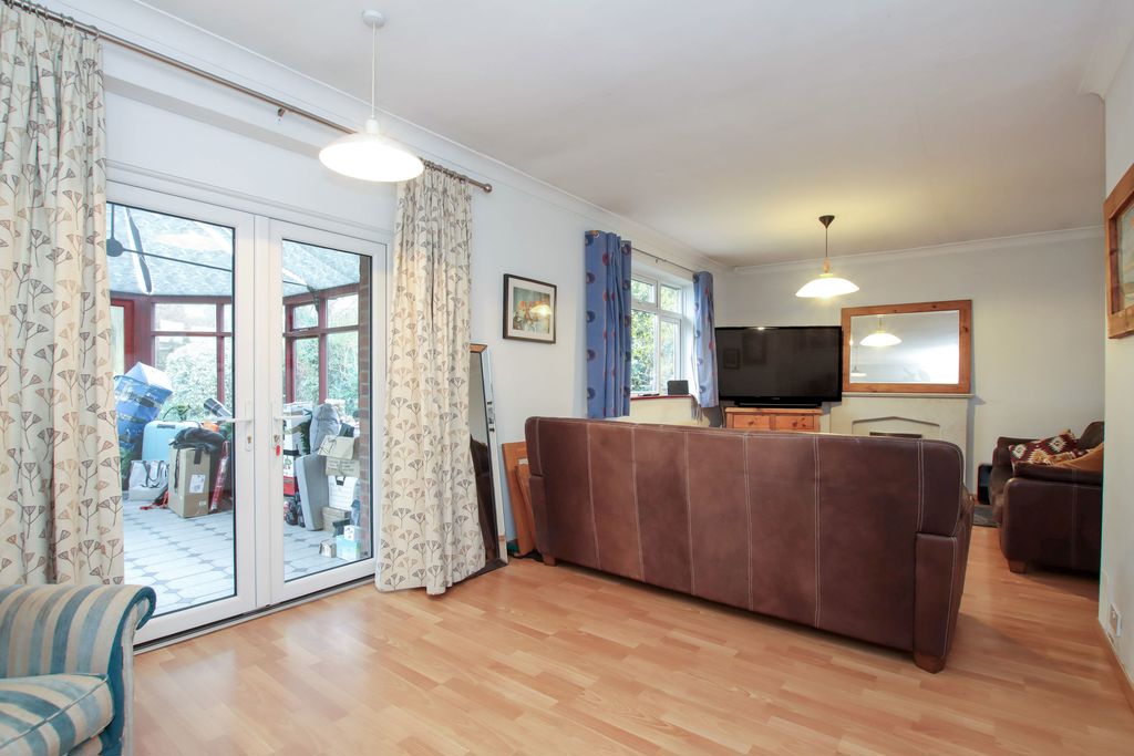L shaped room, double glazed window to front, side and rear, feature fire place, three radiators, double glazed double doors to conservatory.