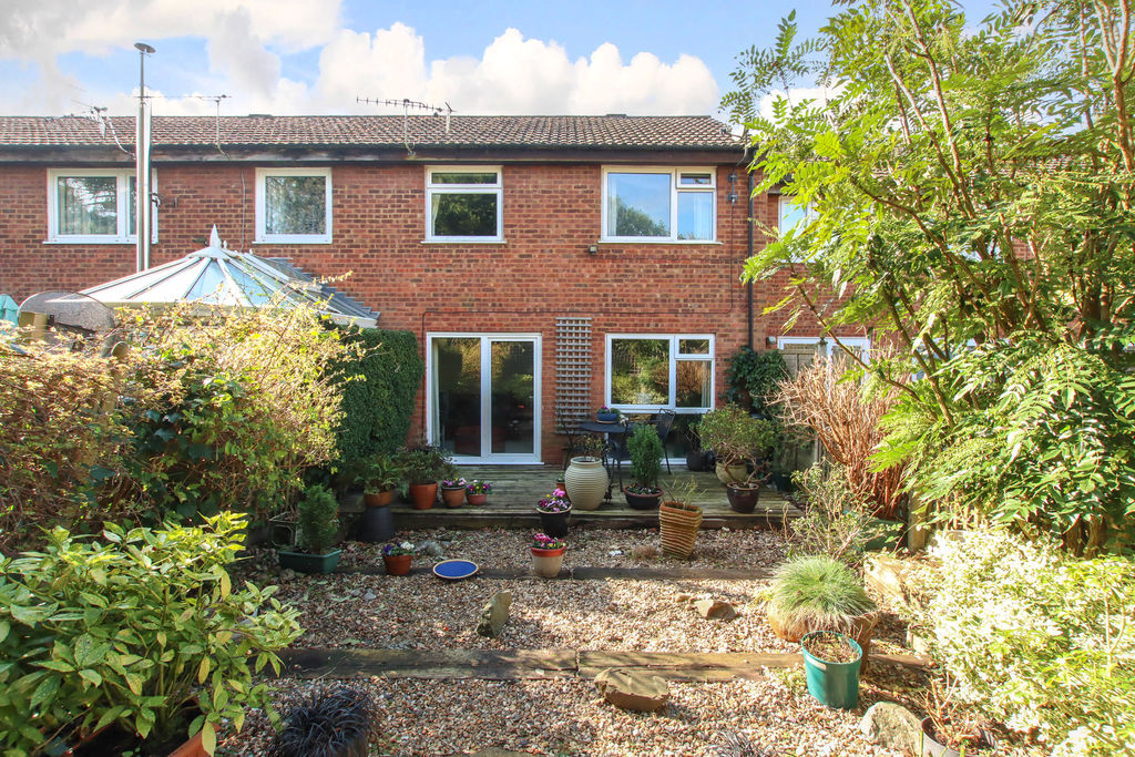 Garden with decking area, patio area, rear gated access, enclosed by panel fencing.