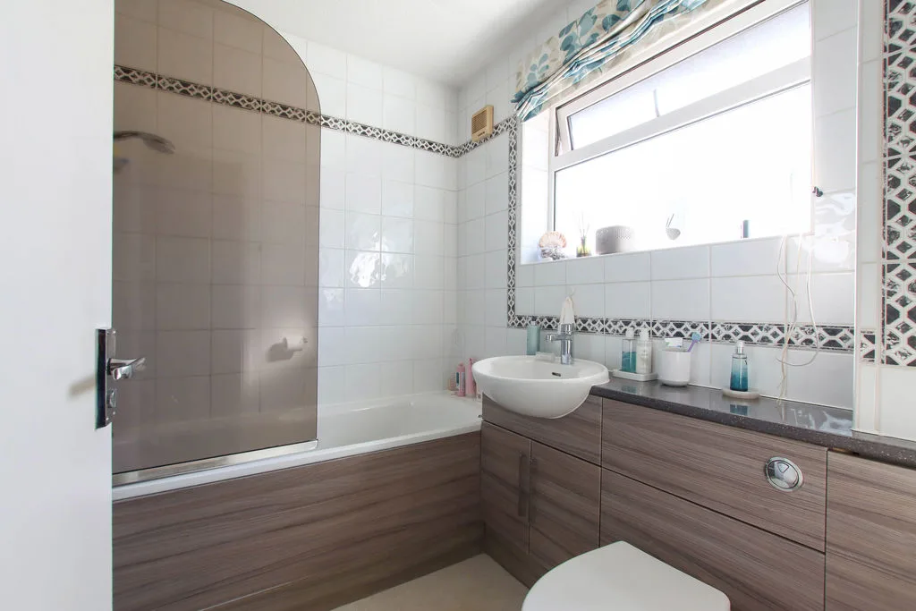 Double glazed frosted window to front aspect. Low level WC, pedestal wash hand basin with mixer tap, panelled bath with shower over, shaver point, extractor fan, part tiled.