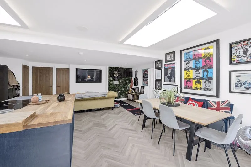 Two double glazed skylights, double glazed bi-fold doors and window to rear aspect. Utility cupboard, understairs storage cupboard, two radiators. Range of wall mounted and floor standing units with solid wood work surface over, inset butler sink, integrated electric oven, integrated dishwasher, space for fridge/freezer, island with induction hob and breakfast bar, Sonos sound system, lighting controlled by smart system.