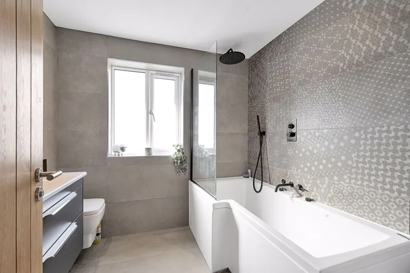 Frosted double glazed window to rear aspect. Low level wc.., with concealed system, wash hand basin in vanity unit, 'L' shaped panelled bath with shower over, towel radiator, tiled walls and floor, extractor fan.
