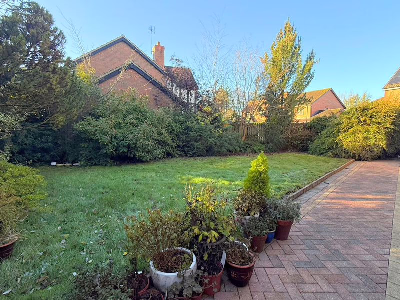 A south-facing, mature garden that is mainly laid to lawn and enclosed by timber fencing panels, outside tap, side gated access, door to garage.