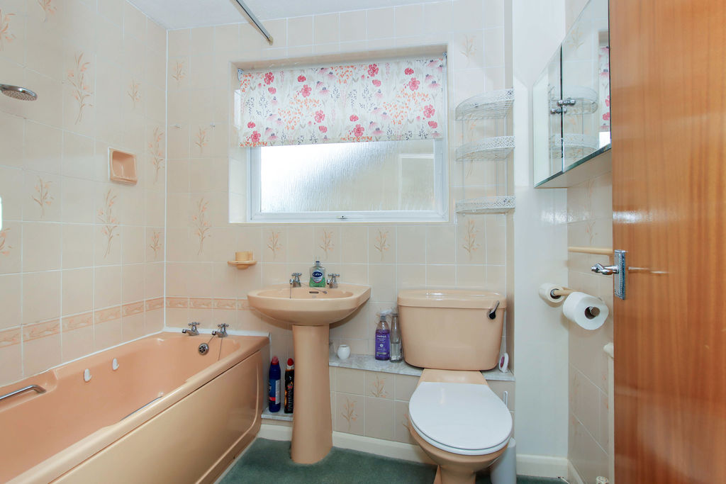 A three piece suite comprising a low level WC, wash hand basin, panel bath with shower over, tiled surrounds, radiator, double glazed window to the side.