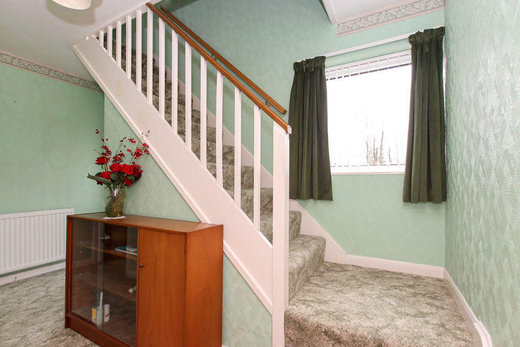 Stair to the first floor, access to the loft, door to the airing cupboard, double glazed window to the front.