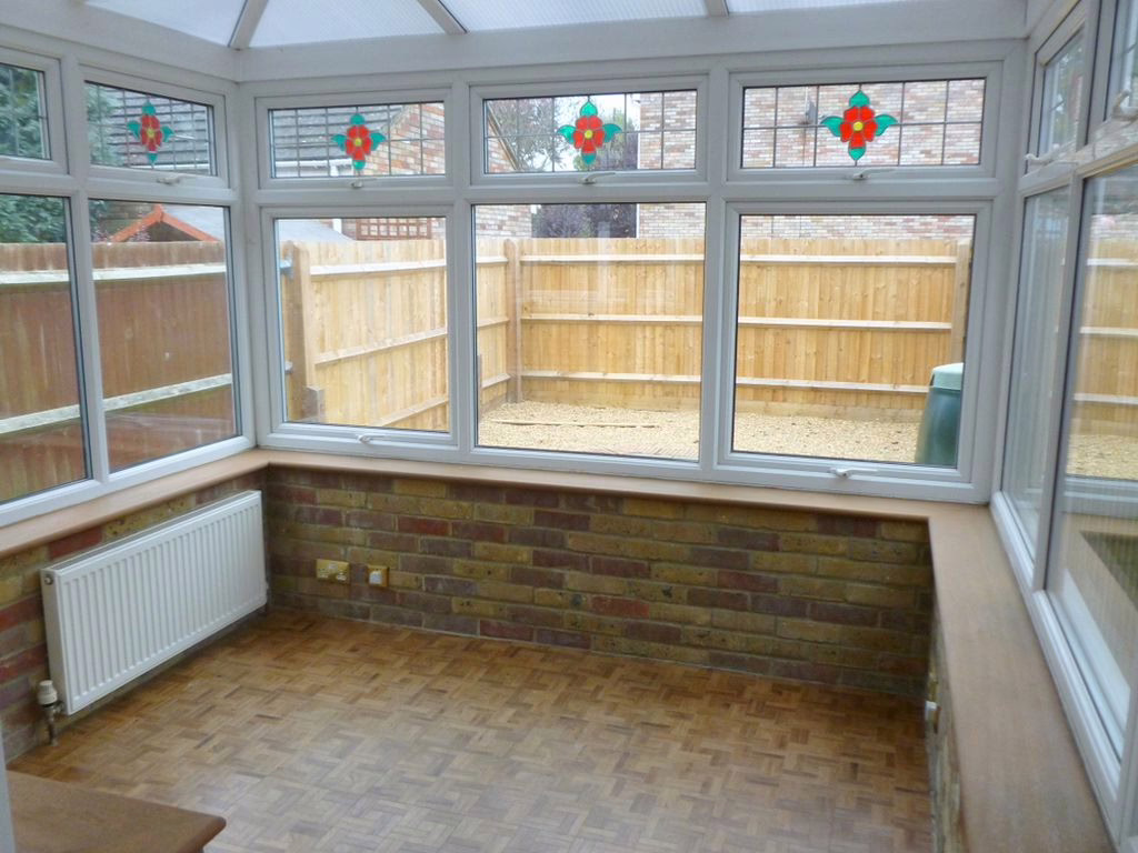 Double glazed conservatory on a brick base with double glazed door to garden, two radiators.
