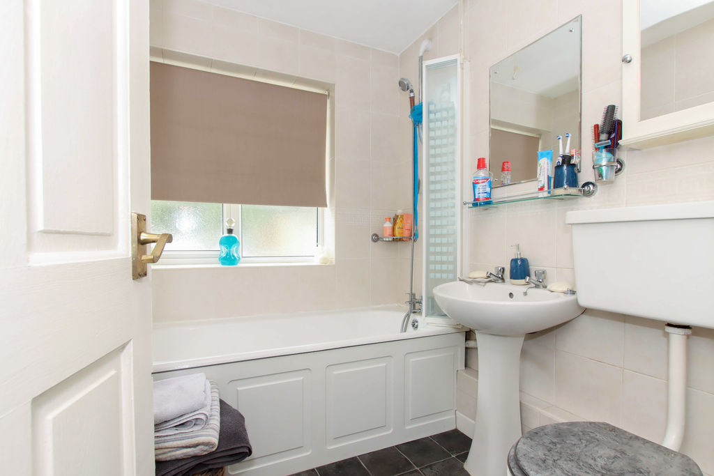 WC, pedestal hand wash basin , frosted double glazed window to rear, panel bath with shower over, radiator.