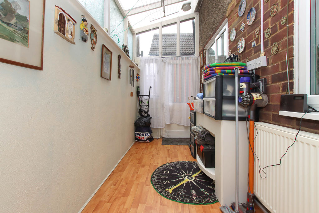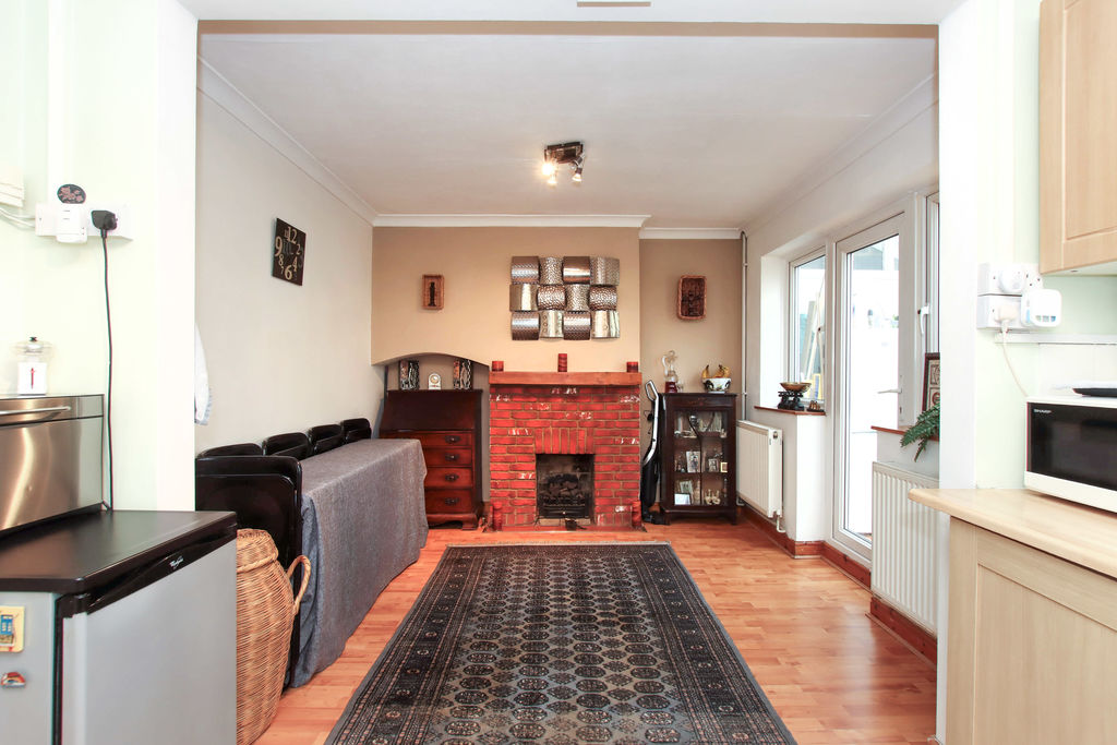 Range of floor and wall mounted units, stainless steel sink with drainer, gas hob with extractor fan over, built in oven, space for washing machine, radiator, feature fireplace, door to garden room, double glazed window to garden room.