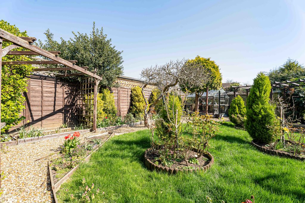 Door to three storage areas, door to lean to, mainly laid to lawn with patio area, enclosed by wooden fencing panels, greenhouse, gravel space, flower border, side gate.