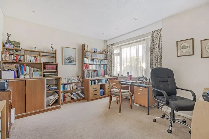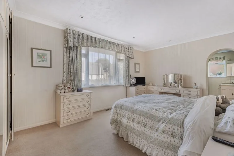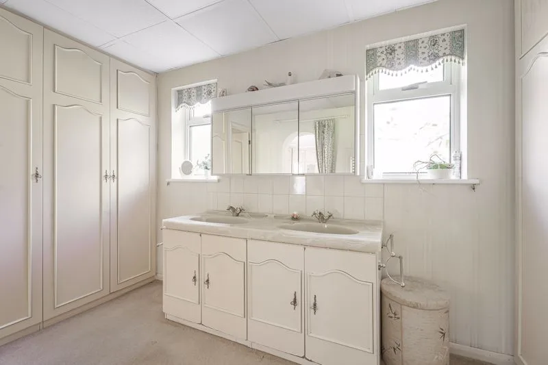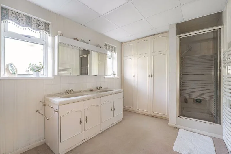 Two frosted double glazed windows to side aspect. Electric heated towel rail, shower cubicle, two vanity sink units, fitted triple wardrobes, door to w.c.