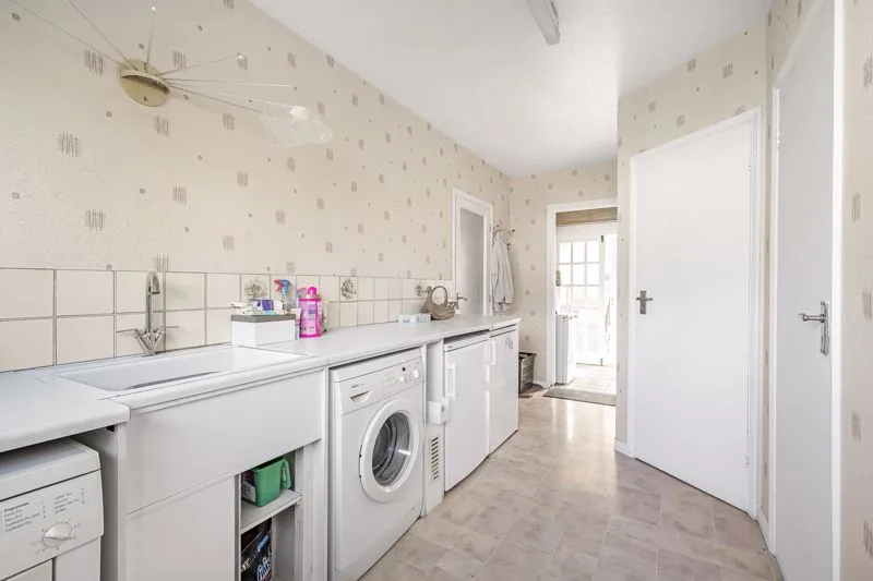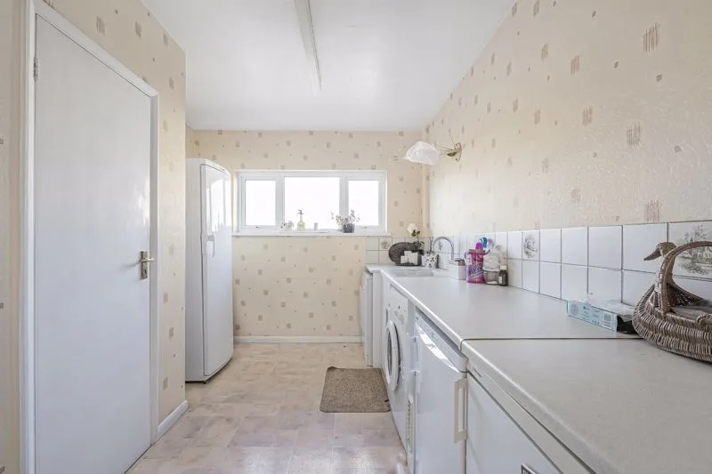 Frosted double glazed window to front aspect. Porcelain sink with mixer tap, two storage cupboards, roll top work surface, space for washing machine and dryer, undercounter fridge and freezer, tiled splash back.