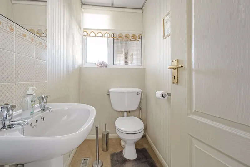 Frosted double glazed window to front aspect. Low level w.c., pedestal wash hand basin, tiled splash back, warm air vent.