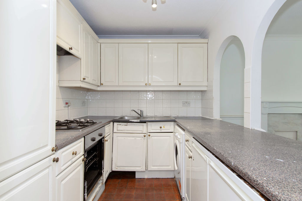 In need of updating with base and eye level storage units, work surface areas, inset single drainer sink unit with mixer tap, plumbing and space for washing machine, tiled surrounds.