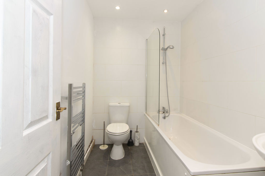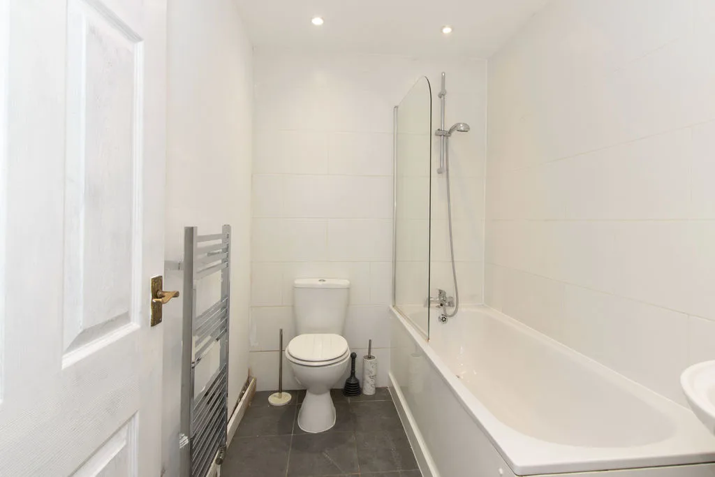 A white three piece suite comprising a low level WC, pedestal wash hand basin, panel bath with mixer tap and shower over, tiled surrounds, heated towel rail, spot lighting, extractor fan.