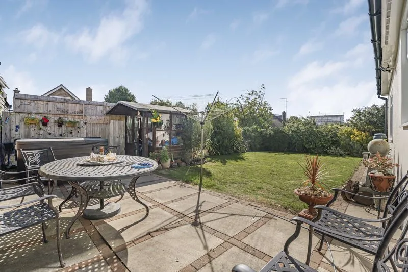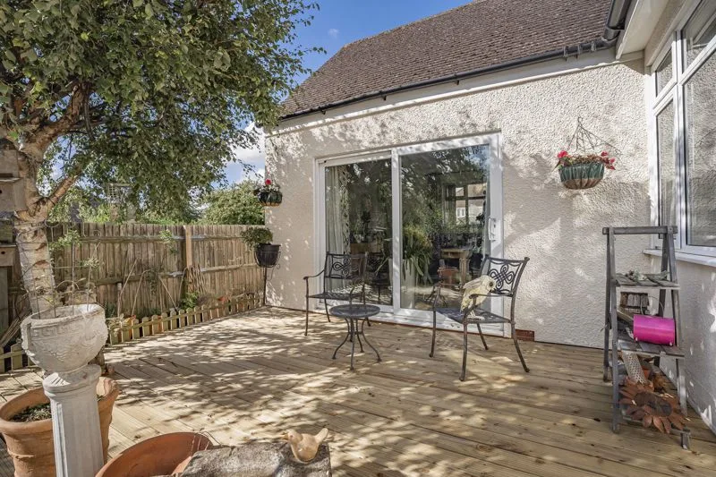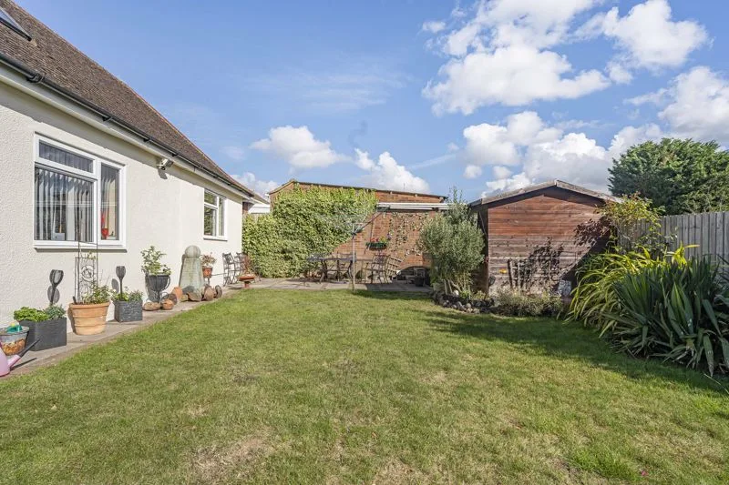 Mainly laid to lawn with deck area, flower and shrub borders, patio area, shed awning, side gated access, enclosed by fencing panels.