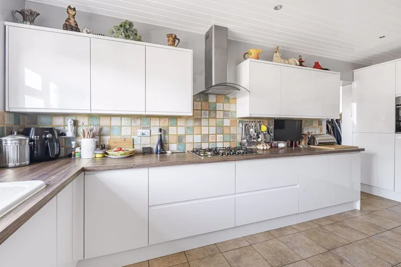 Double glazed window to front aspect. Range of wall mounted and floor standing units with square edge work surface, integrated five ring gas hob and oven, integrated microwave, fridge & freezer and washing machine,space for dishwasher, one and a half sink with mixer tap, radiator, tiled splash back, tiled floor, open to side passage.