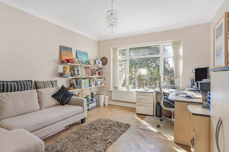 Double glazed bay seated window to front aspect. Two radiators, electric fireplace, open to dining room via two steps.