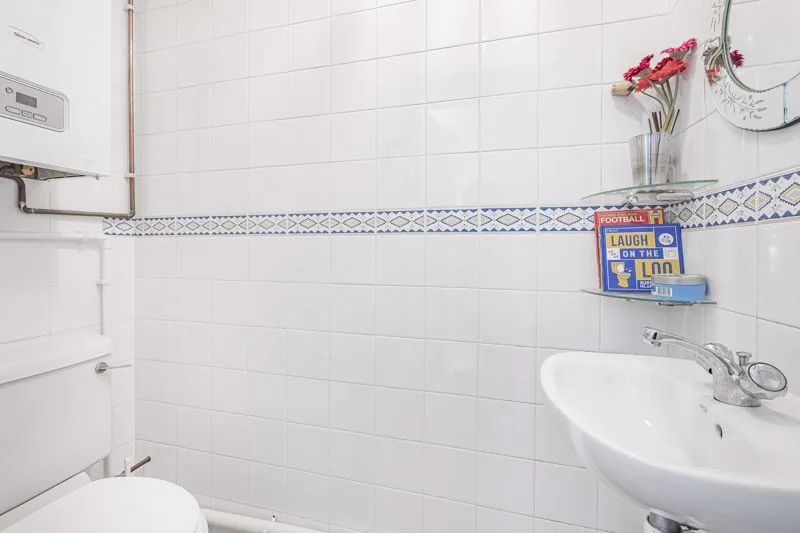 Low level w.c., wash hand basin, wall mounted boiler, tiled walls and floor.