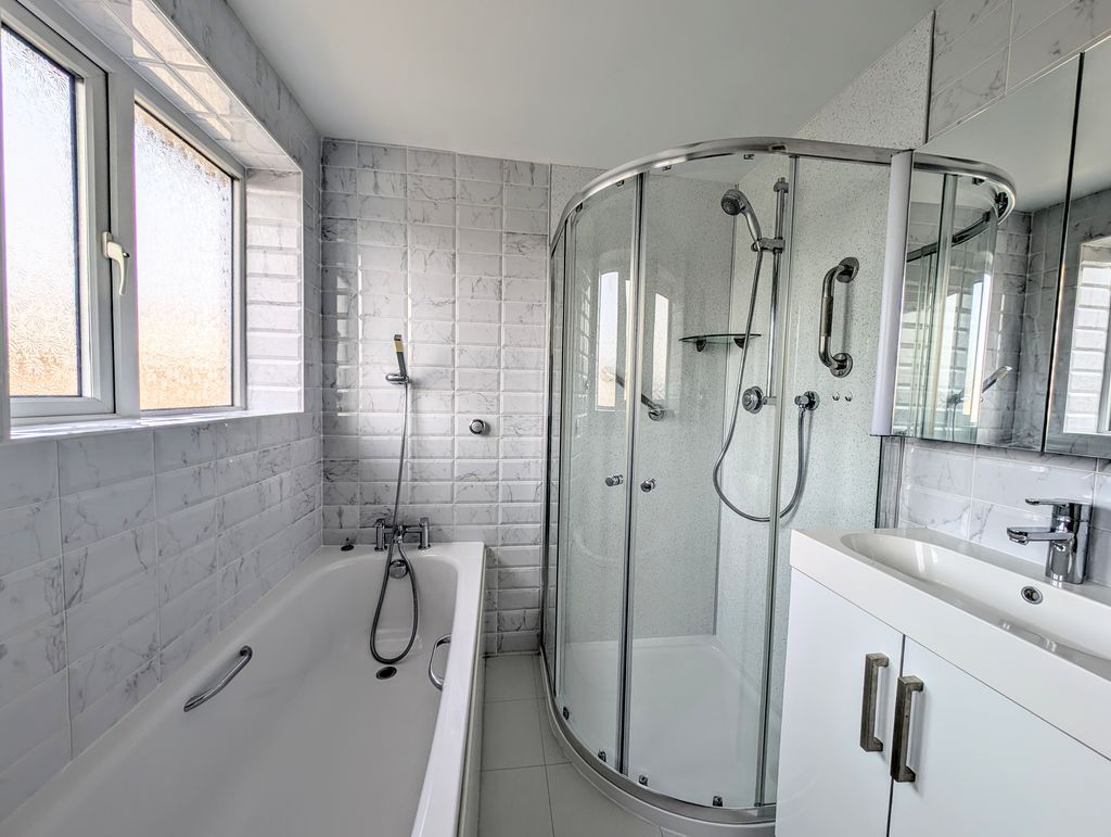 Two frosted double glazed windows to rear aspect. Low level w.c., panelled bath with shower over, shower cubicle, vanity wash hand basin with mixer tap and storage, wall mounted mirror with storage, heated towel rail, fully tiled.