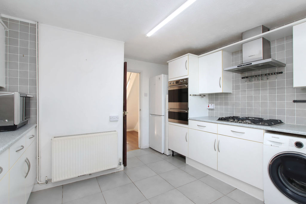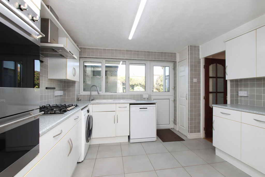 Double glazed window to rear aspect. Range of wall mounted and floor standing units with roll edge work surface over, integrated oven and gas hob with extractor over, space for fridge/freezer, washing machine and dishwasher, sink and drainer with mixer tap, built in storage cupboard, door leading to garden.