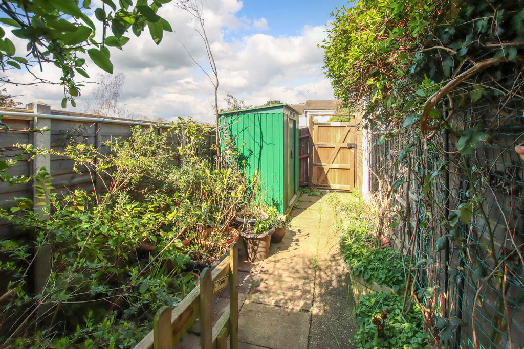 Patio gardens with rear access, garden shed, access to garage.