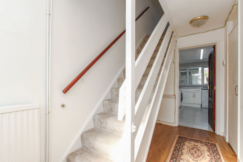 Frosted double glazed window to front aspect. Stairs to first floor, built in storage cupboard, radiator, doors to open plan lounge/diner.