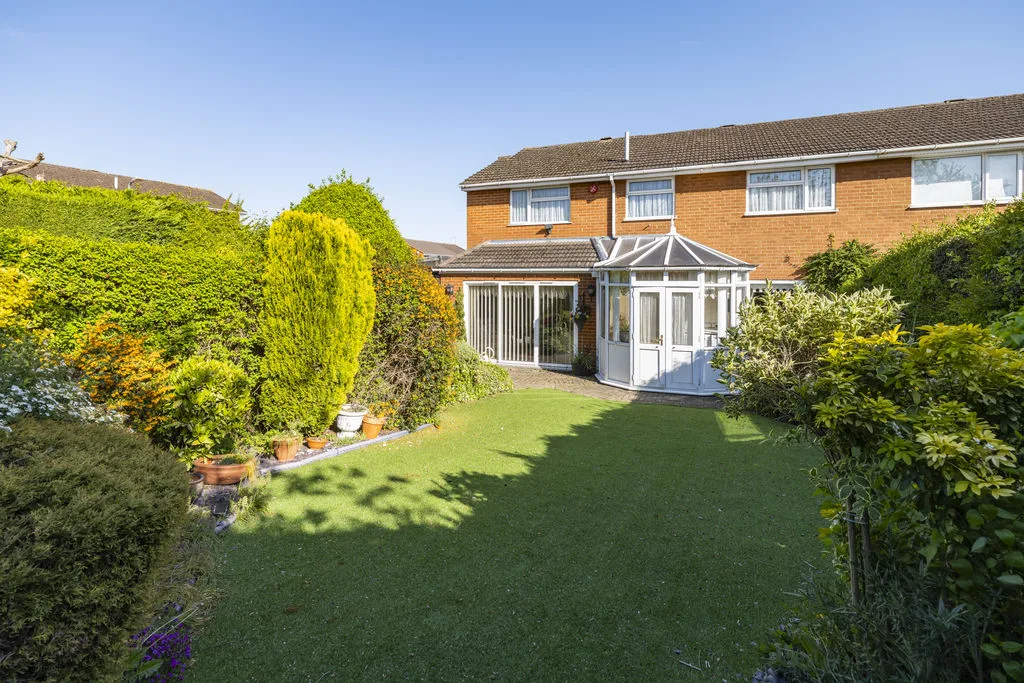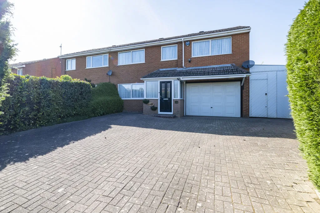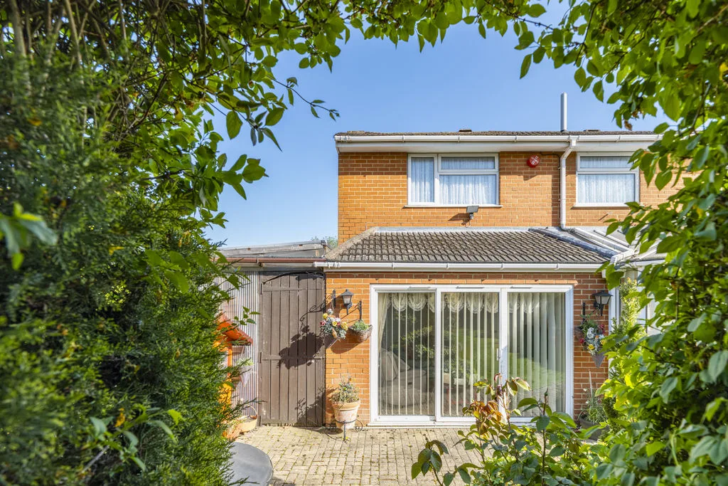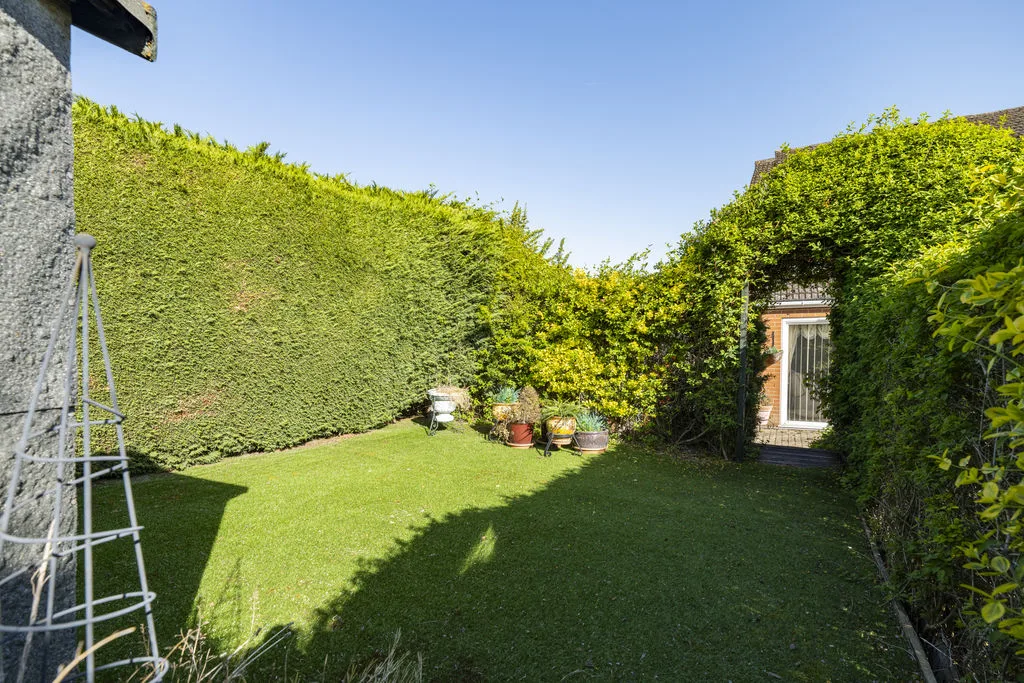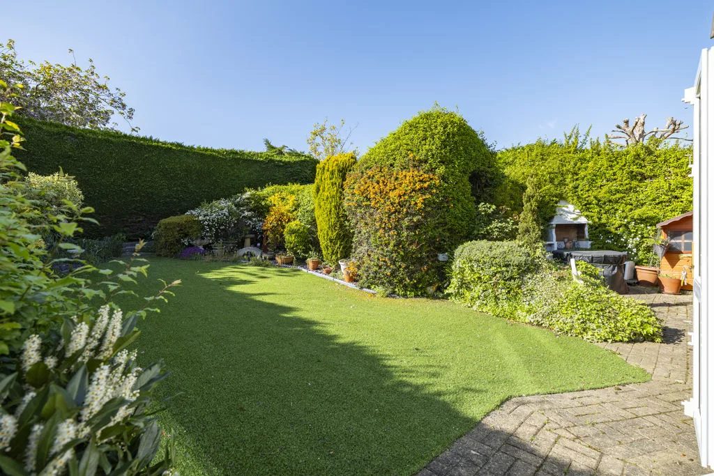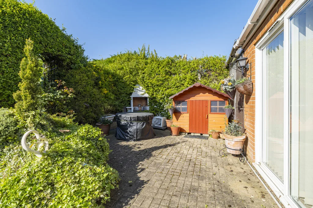 Block paved providing off road parking for several cars, enclosed by hedging, door to side storage area.