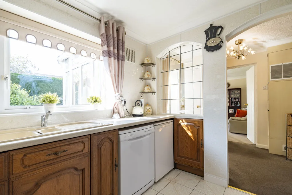 Double glazed window to rear aspect. Range of wall mounted and floor standing units with rolled top work surface, one and half composite sink with mixer tap, space for cooker, extractor hood, space for dishwasher, fridge/freezer and fridge, tiled floor.