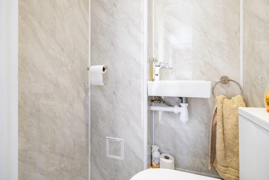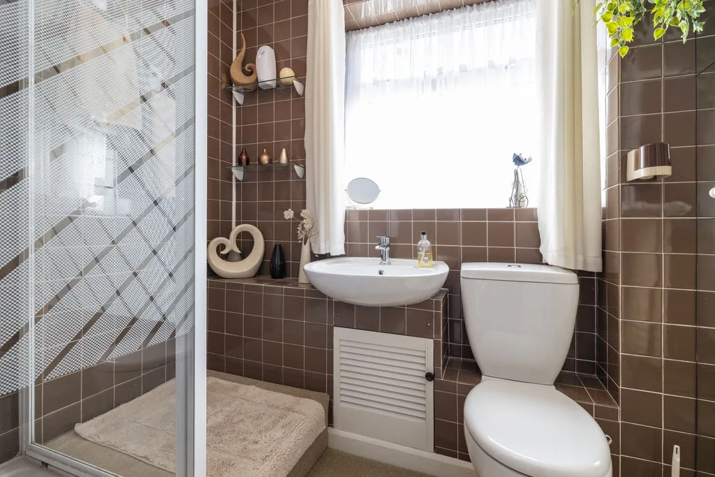 Frosted double glazed window to rear aspect. Low level w.c., wash hand basin with mixer tap, shower cubicle with electric shower, fully tiled walls.