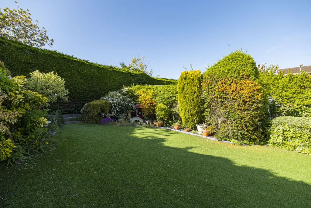 Tiered, laid to artificial grass with patio area, enclosed by hedging, stone border, flowers, trees and shrubs, electric socket, three taps, three sheds, door to garage.