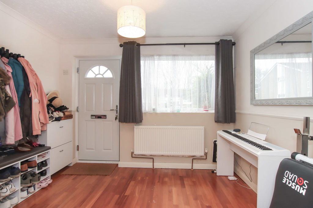 An extended entrance hall with double glazed window to the front, radiator, wood effect flooring.