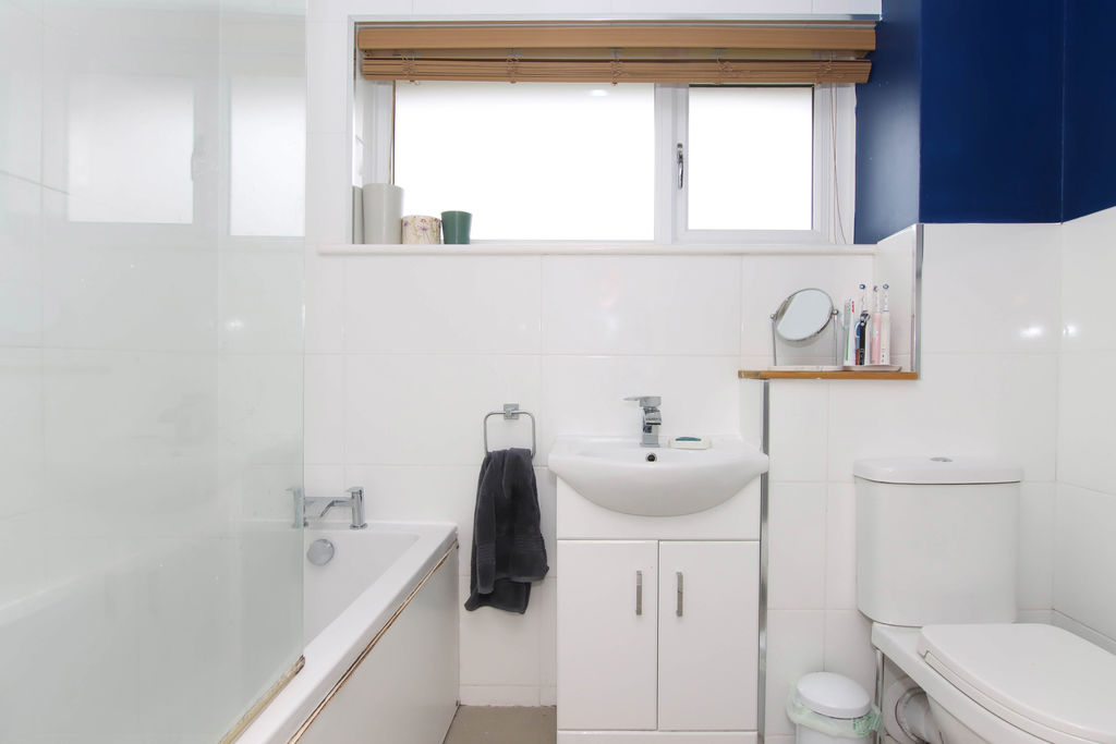 A refitted three piece suite comprising a low level WC, wash hand basin with mixer tap housed in a vanity unit with cupboard below, bath with mixer tap and electric shower over, tiled surrounds and flooring, heated towel rail, double glazed window to the rear.