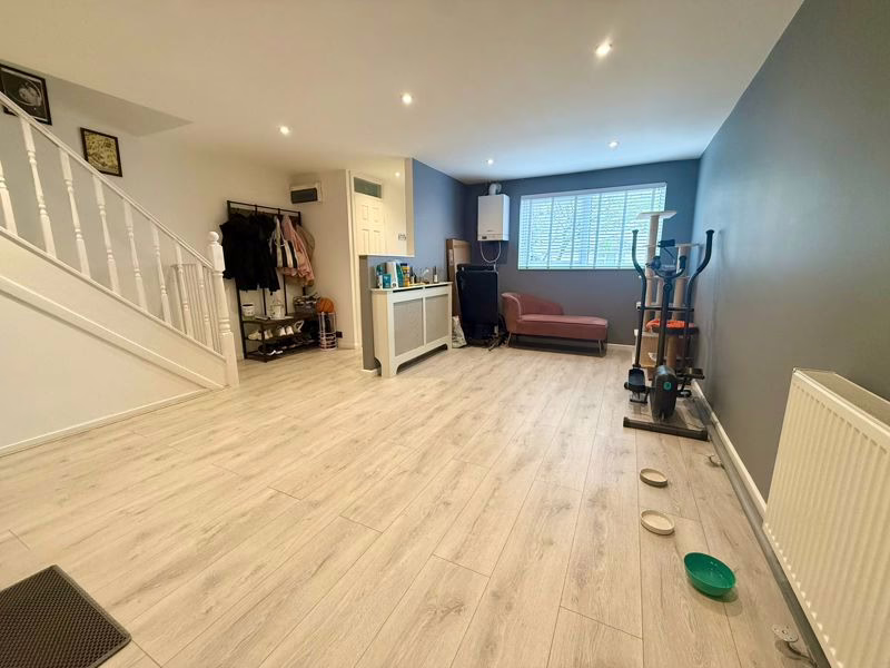 UPVC double glazed window to front aspect. Wall-mounted boiler, radiator, stairs rising to first floor, under stairs storage cupboard, door to second reception room.